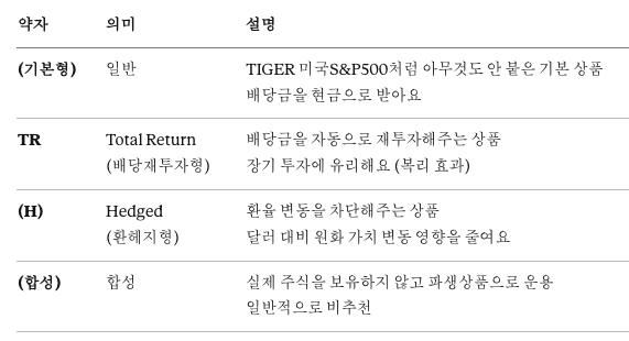ETF 이름 뒤에 (H), TR 같은 게 붙어있는 걸 자주 보셨을 거예요.